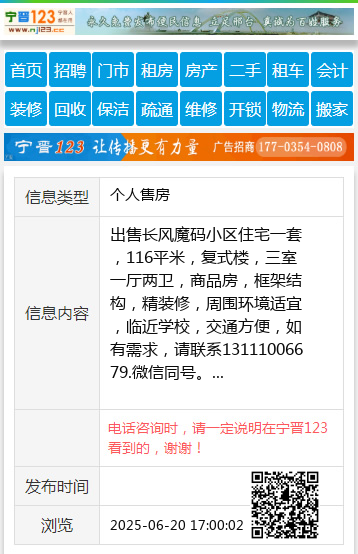 出售长风魔码小区住宅一套 ,116平米,复式楼,三室一厅两卫,商品房,框架结构,精装修,周围环境适宜,临近学校,交通方便,如有需求,请联系13111006679.微信同号。 【电话咨询时,请一定说明在太原生活网看到的,谢谢!】 |