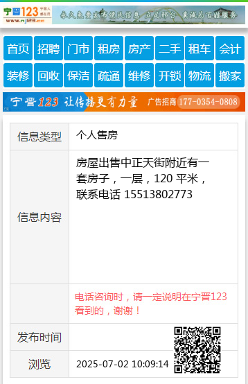 房屋出售中正天街附近有一套房子,一层,120 平米,联系电话 15513802773