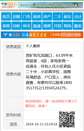 西矿街瓦流路口,63.09平米两居室,4层,家电家具一应俱全,拎包入住 小区紧临二十中,小初高学校,周围环境舒适,户口签入,房东直售,有意向可以联系18003517352/13934524279