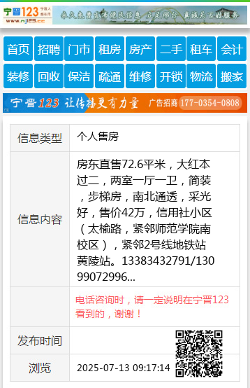 房东直售72.6平米,大红本过二,两室一厅一卫,简装,步梯房,南北通透,采光好,售价42万,信用社小区(太榆路,紧邻师范学院南校区),紧邻2号线地铁站黄陵站。13383432791/13099072996 【电话咨询时,请一定说明在太原生活网看到的,谢谢!】 |