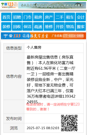 最新房屋出售信息(房东直售):本人在敦化坊富力城附近有61.96平米(二室一厅一卫)一层楼房一套出售