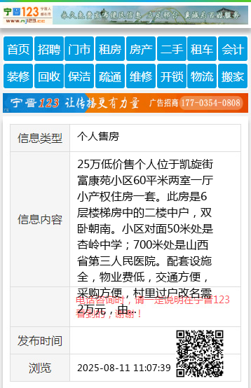 25万低价售个人位于凯旋街富康苑小区60平米两室一厅小产权住房一套。