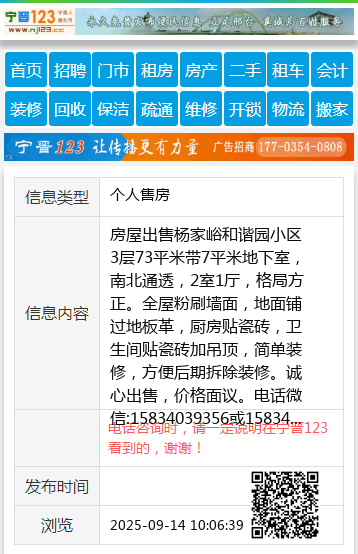 房屋出售 杨家峪和谐园小区3层73平米带7平米地下室,南北通透,2室1厅,格局方正。全屋粉刷墙面,地面铺过地板革,厨房贴瓷砖,卫生间贴瓷砖加吊顶,简单装修,方便后期拆除装修。诚心出售,价格面议。 电话微信:15834039356或15834048926