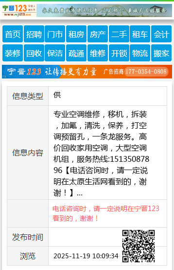 专业空调维修,移机,拆装,加氟,清洗,保养,打空调预留孔,一条龙服务。高价回收家用空调,大型空调机组,服务热线:15135087896 【电话咨询时,请一定说明在太原生活网看到的,谢谢!】 |