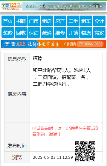 和平北路帮厨1人。洗碗1人,工资面议。招配菜一名,二把刀学徒也行.。 【电话咨询时,请一定说明在太原生活网看到的,谢谢!】 |
