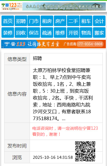 太原万柏林学校食堂招聘兼职:1、早上7点到中午卖完饭收拾完,1名,2、晚上兼职,5:30上班,到卖完饭收拾完,2名。手快,干活利索,地址:西苑南路和九院沙河交叉口,有意者联系18735188174。 【电话咨询时,请一定说明在太原生活网看到的,谢谢!】 |