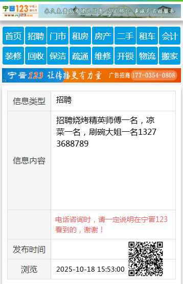 招聘烧烤精英师傅一名,凉菜一名,刷碗大姐一名 13273688789