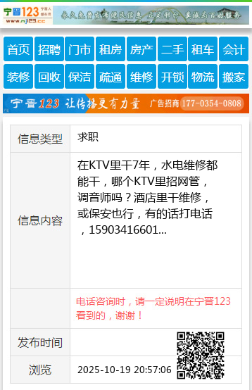 在KTV里干7年,水电维修都能干,哪个KTV里招网管,调音师吗?酒店里干维修,或保安也行,有的话打电话,15903416601 【电话咨询时,请一定说明在太原生活网看到的,谢谢!】 |