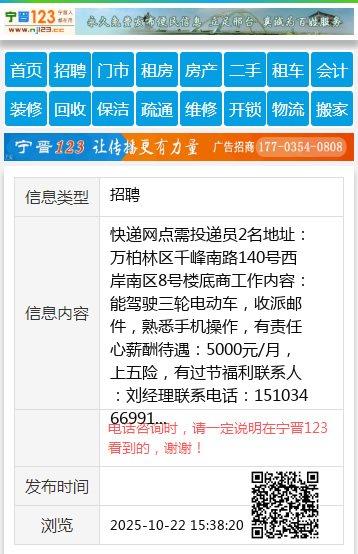 快递网点需投递员2名 地址:万柏林区千峰南路140号西岸南区8号楼底商 工作内容:能驾驶三轮电动车,收派邮件,熟悉手机操作,有责任心 薪酬待遇:5000元/月,上五险,有过节福利 联系人:刘经理 联系电话:15103466991