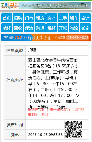 西山建北老字号牛肉拉面馆招服务员3名(18-55周岁),身体健康,工作积极,有责任心。工作时间:早班(早上6:30--下午15:00左右),二班(上午9:30-下午14:00,晚上17:00=22:00左右),早班一周倒二班一周循环,工资面议,有意者请联系13643472198