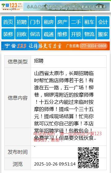 山西省太原市,长期招聘临时帮忙跑店师傅若干名!有谁在五一路,五一广场!柳巷,铜锣湾附近的按摩师傅!十五分之内能过来临时按摩的师傅!提成一个三十五元!提成现场结算!忙完你就可以忙你自己的事!本店常年招聘学徒!包教包会!免费学习!但是要交钱伙食费,非诚勿扰!工作地址在铜锣湾国际公寓A座六层二号!欢迎大家过来实地考察了解!联系电话18035151865 【电话咨询时,请一定说明在太原生活网看到的,谢谢!】 |