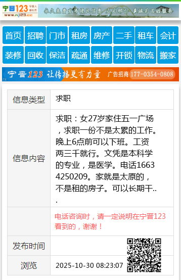 求职:女27岁家住五一广场,求职一份不是太累的工作。晚上6点前可以下班。工资两三千就行。文凭是本科学的专业,是医学。电话16634250209。家就是太原的,不是租的房子。可以长期干 【电话咨询时,请一定说明在太原生活网看到的,谢谢!】 |