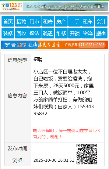 小店区一位不自理老太太,自己吃饭,需要给擦洗,抱下来尿,28天5000元,家里三口人,做饭简单,100平方的家简单打扫,有做的姐妹们联我(自家人)15534395832 【电话咨询时,请一定说明在太原生活网看到的,谢谢!】 |