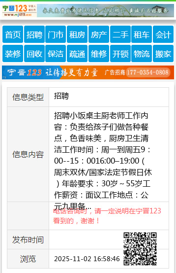 招聘小饭桌主厨老师 工作内容:负责给孩子们做各种餐点,色香味美,厨房卫生清洁 工作时间:周一到周五9:00--15:00 16:00–19:00(周末双休/国家法定节假日休) 年龄要求:30岁~55岁 工作薪资:面议 工作地点:公元九里 备注:有爱心、喜欢孩子, 有一定做饭经验者优先,特别强调一定要干净卫生。 联系电话:郭老师15235382020 |