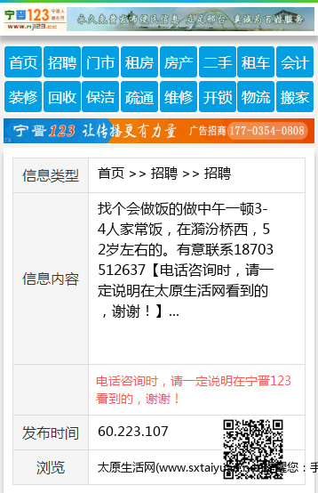 找个会做饭的做中午一顿3-4人家常饭,在漪汾桥西,52岁左右的。有意联系18703512637 【电话咨询时,请一定说明在太原生活网看到的,谢谢!】 |