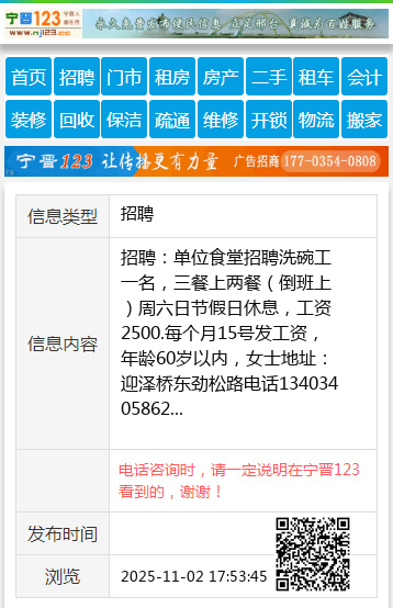 招聘:单位食堂招聘洗碗工一名,三餐上两餐(倒班上) 周六日节假日休息,工资2500. 每个月15号发工资,年龄60岁以内,女士 地址:迎泽桥东劲松路 电话13403405862
