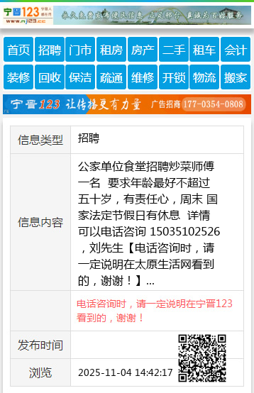 公家单位食堂招聘炒菜师傅一名 要求年龄最好不超过五十岁,有责任心,周末 国家法定节假日有休息 详情可以电话咨询 15035102526,刘先生 【电话咨询时,请一定说明在太原生活网看到的,谢谢!】 |