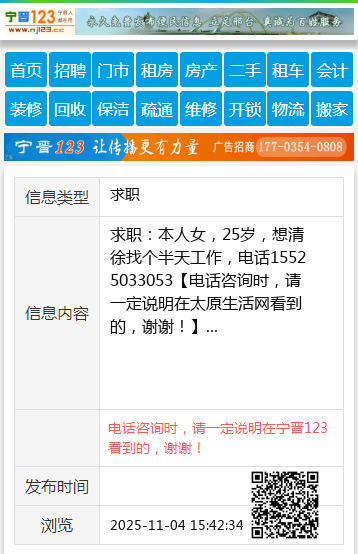 求职:本人女,25岁,想清徐找个半天工作,电话15525033053 【电话咨询时,请一定说明在太原生活网看到的,谢谢!】 |