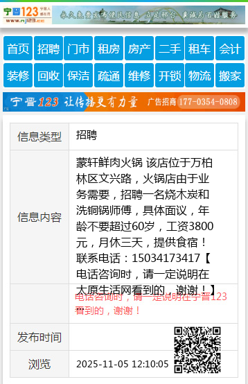 蒙轩鲜肉火锅 该店位于万柏林区文兴路,火锅店由于业务需要,招聘一名烧木炭和洗铜锅师傅,具体面议,年龄不要超过60岁,工资3800元,月休三天,提供食宿!联系电话:15034173417 【电话咨询时,请一定说明在太原生活网看到的,谢谢!】 |