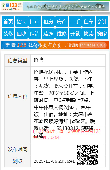 招聘配送司机:主要工作内容:早上配货,送货、下午:配货。要求会开车,识字。年龄:20岁至50岁之间。上班时间:早6点到晚上7点。中午休息大概2小时。包午饭,住宿。地址:太原市杏花岭区顶好海鲜市场s区。联系电话:15513031215薪资待遇详聊➕微信私聊 【电话咨询时,请一定说明在太原生活网看到的,谢谢!】 |