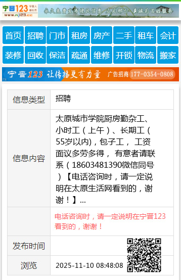 太原城市学院厨房勤杂工、小时工(上午)、长期工(55岁以内),包子工, 工资面议多劳多得, 有意者请联系(18603481390微信同号) 【电话咨询时,请一定说明在太原生活网看到的,谢谢!】 |