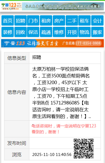 太原万柏林一学校招保洁俩名,工资3500面点帮厨俩名,工资3200,45岁以下 太原小店一学校招上午临时工,工资70,下午短期工5点半到8点 15712986085 【电话咨询时,请一定说明在太原生活网看到的,谢谢!】 |