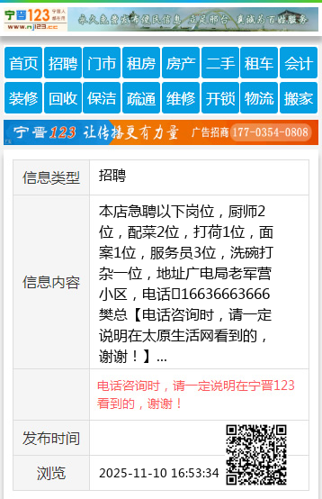 | 防骗提醒: | 太原生活网(www.sxtaiyuan.net)提醒您:手工活、网络兼职、刷单,都是骗子!凡以各种名义收取费用的都是骗子!找工作是往兜里挣钱,让你往外掏钱的都是骗子!异地招聘请提高警惕,谨防诈骗! |