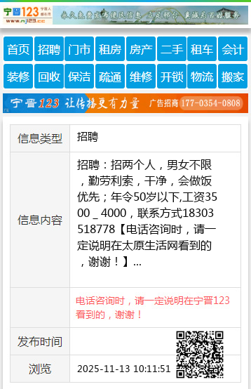 招聘:招两个人,男女不限,勤劳利索,干净,会做饭优先;年令50岁以下,工资3500_4000,联系方式18303518778 【电话咨询时,请一定说明在太原生活网看到的,谢谢!】 |