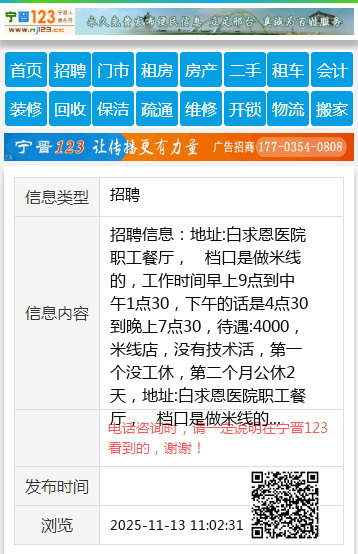 地址:白求恩医院职工餐厅, 档口是做米线的,工作时间早上9点到中午1点30,下午的话是4点30到晚上7点30,待遇:4000,米线店,没有技术活,第一个没工休,第二个月公休2天,地址:白求恩医院职工餐厅, 档口是做米线的,工作时间早上9点到中午1点30,下午的话是4点30到晚上7点30,待遇:4000,米线店,没有技术活