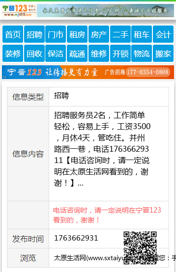 招聘服务员2名,工作简单轻松,容易上手,工资3500,月休4天,管吃住。并州路西一巷,电话17636629311