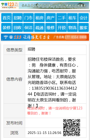 招聘住宅楼保洁数名,要求:男 身体健康,有责任心,沟通能力强,吃苦耐劳,服从管理。