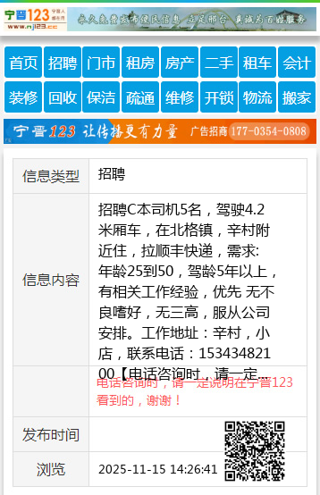 招聘C本司机5名,驾驶4.2米厢车,在北格镇,辛村附近住,拉顺丰快递,需求: 年龄25到50,驾龄5年以上,有相关工作经验,优先 无不良嗜好,无三高,服从公司安排。工作地址:辛村,小店,联系电话:15343482100 【电话咨询时,请一定说明在太原生活网看到的,谢谢!】 |