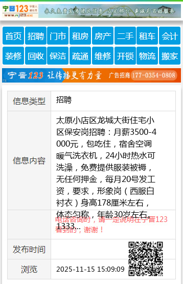 太原小店区龙城大街住宅小区保安岗招聘:月薪3500-4000元,包吃住,宿舍空调暖气洗衣机,24小时热水可洗澡,免费提供服装被褥,无任何押金,每月20号发工资,要求,形象岗(西服白衬衣)身高178厘米左右,体态匀称,年龄30岁左右。13333461787 【电话咨询时,请一定说明在太原生活网看到的,谢谢!】 |