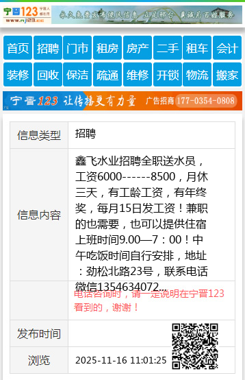 鑫飞水业招聘全职送水员,工资6000------8500,月休三天,有工龄工资,有年终奖,每月15日发工资!兼职的也需要,也可以提供住宿上班时间9.00—7:00!中午吃饭时间自行安排,地址:劲松北路23号,联系电话微信13546340729!18235165473! 【电话咨询时,请一定说明在太原生活网看到的,谢谢!】 |
