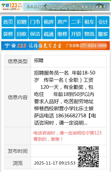 招聘服务员一名 年龄18-50岁