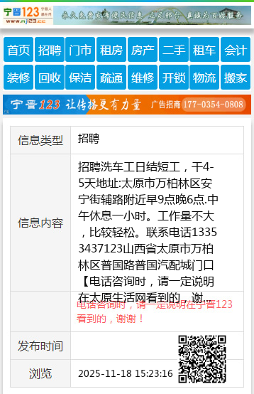 地址:太原市万柏林区安宁街辅路附近早9点晚6点.中午休息一小时。工作量不大,比较轻松。