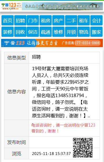 19号财富大厦需要培训充场人员2人,总共5天必须连续听课,年龄要求22到45岁之间,工资一天90元中午管饭,报名电话13485318794,微信同号,鸽子勿扰。 【电话咨询时,请一定说明在太原生活网看到的,谢谢!】 |