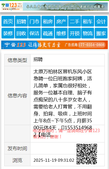 太原万柏林区晋机东风小区急聘一位白班跑家阿姨,活儿简单,家属也很好相处,服务一位基本自理、脑子有点痴呆的八十多岁女老人,需要给老人打胃管,不用翻身、拍背、吸痰,上班时间上午8点~下午5点,月薪3500元休4天,☎15535149682 【电话咨询时,请一定说明在太原生活网看到的,谢谢!】 |