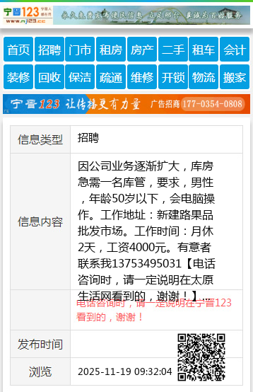 因公司业务逐渐扩大,库房急需一名库管,要求,男性,年龄50岁以下,会电脑操作。工作地址:新建路果品批发市场。工作时间:月休2天,工资4000元。有意者联系我13753495031 【电话咨询时,请一定说明在太原生活网看到的,谢谢!】 |