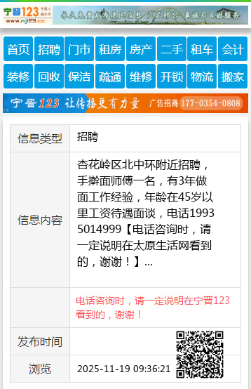 杏花岭区北中环附近招聘,手擀面师傅一名,有3年做面工作经验,年龄在45岁以里工资待遇面谈,电话19935014999 【电话咨询时,请一定说明在太原生活网看到的,谢谢!】 |