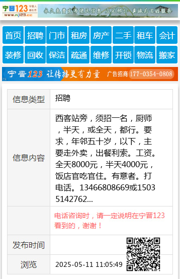 西客站旁,须招一名,厨师,半天,或全天,都行。要求,年邻五十岁,以下,主要走外卖,出餐利索。工资。全天8000元,半天4000元,饭店官吃官住。有意者。打电话。13466808669或15035142762 【电话咨询时,请一定说明在太原生活网看到的,谢谢!】 |