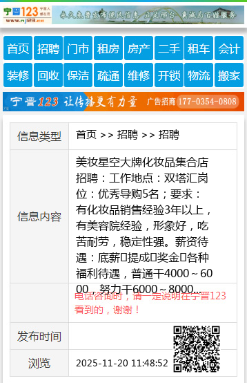 要求:有化妆品销售经验3年以上,有美容院经验,形象好,吃苦耐劳,稳定性强。