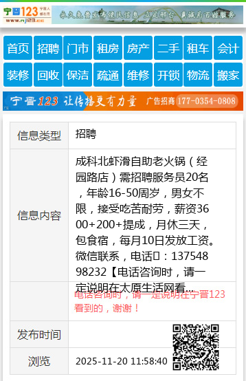 成科北虾滑自助老火锅(经园路店)需招聘服务员20名,年龄16-50周岁,男女不限,接受吃苦耐劳,薪资3600+200+提成,月休三天,包食宿,每月10日发放工资。微信联系,电话☎:13754898232 【电话咨询时,请一定说明在太原生活网看到的,谢谢!】 |