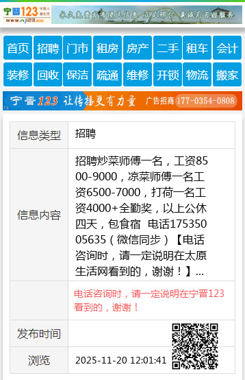 招聘炒菜师傅一名,工资8500-9000,凉菜师傅一名工资6500-7000,打荷一名工资4000+全勤奖,以上公休四天,包食宿 电话17535005635(微信同步) 【电话咨询时,请一定说明在太原生活网看到的,谢谢!】 |