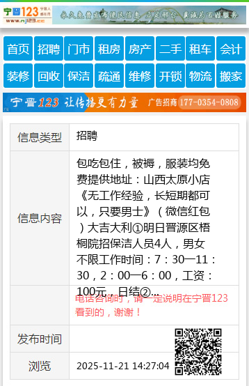 ①明日晋源区梧桐院招保洁人员4人,男女不限