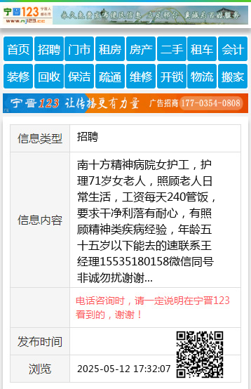南十方精神病院女护工,护理71岁女老人,照顾老人日常生活,工资每天240管饭,要求干净利落有耐心,有照顾精神类疾病经验,年龄五十五岁以下能去的速联系王经理15535180158微信同号非诚勿扰谢谢 【电话咨询时,请一定说明在太原生活网看到的,谢谢!】 |