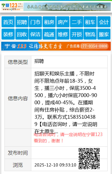 招聊天和娱乐主播,不限时间不限地点年龄18-35,女生,播三小时,保底3500-4500,播六小时保底7000-9000,提成40-45%。在播期间有住房补贴,综合薪资2-3万。联系方式15835104389 【电话咨询时,请一定说明在太原生活网看到的,谢谢!】 |