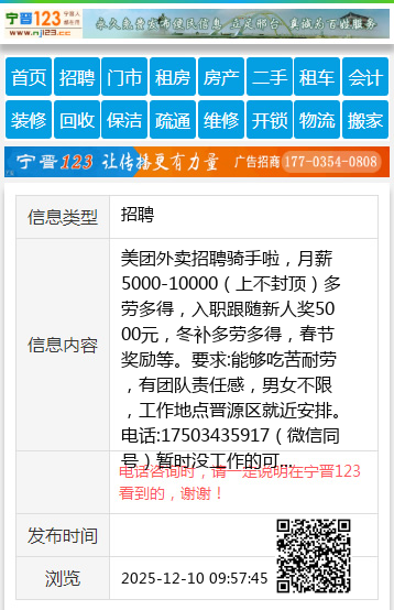 美团外卖招聘骑手啦,月薪5000-10000(上不封顶)多劳多得,入职跟随新人奖5000元,冬补多劳多得,春节奖励等。要求:能够吃苦耐劳,有团队责任感,男女不限,工作地点晋源区就近安排。电话:17503435917(微信同号)暂时没工作的可以先过渡一下 【电话咨询时,请一定说明在太原生活网看到的,谢谢!】 |