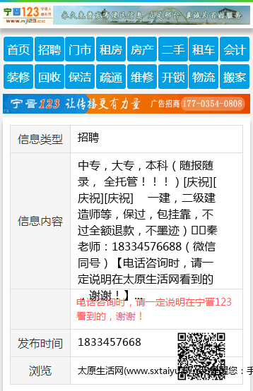 免责声明:本栏目信息由网友自行发布,太原生活网不承担任何责任!提高警惕,谨防诈骗!做推广、做信息置顶!请加太原生活网客服微信:taiyuanwangzhan