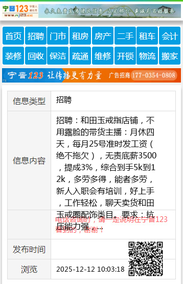 招聘:和田玉戒指店铺,不用露脸的带货主播:月休四天,每月25号准时发工资(绝不拖欠),无责底薪3500,提成3%,综合到手5k到12k,多劳多得,能者多劳,新人入职会有培训,好上手,工作轻松,聊天卖货和田玉戒圈配饰类目。